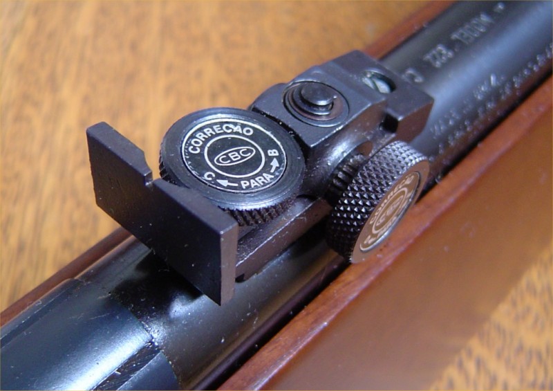 Na verdade era a mesma alça de mira usada nas carabinas de ar comprimido 245 e 345 da CBC, muito simples, embora com correção lateral e vertical. Pecavam, porém, por não serem do tipo clicadas e sim, com ajustes contínuos, o que dificultava o acerto com precisão. Felizmente a CBC lançou, paralelamente, e à venda primeiramente como acessório, uma alça de mira bem superior, com ajustes clicados em ambas as direções, o que finalmente deu à arma um aparelho de pontaria mais preciso e de acordo com a sua finalidade.