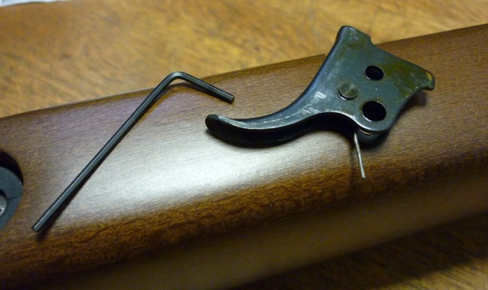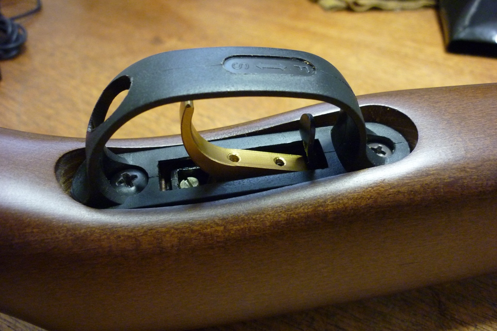 Há dois orifícios com um parafuso tipo Allen em cada um (acompanha uma chave para ajuste). O parafuso frontal deve ser apertado logo após a montagem até que se elimina a folga existente, no movimento da tecla para frente e para trás. O parafuso posterior, mais próximo da curvatura da tecla, serve para ajuste do curso do primeiro e do segundo estágio. Pode-se eliminar o primeiro estágio quase que totalmente, apertando-se este parafuso. Na maioria dos casos nem há a necessidade de se ajustar o parafuso original de ajuste, que ainda se pode ver na foto acima, atrás do gatilho, que pode inclusive ser retirado. Só com essa troca, a arma testada já ficou com uma pressão sobre a tecla do gatilho extremamente boa, algo em torno de 300 a 400 gramas, uma marca dificilmente alcançada por qualquer carabina de ar dessa categoria.
