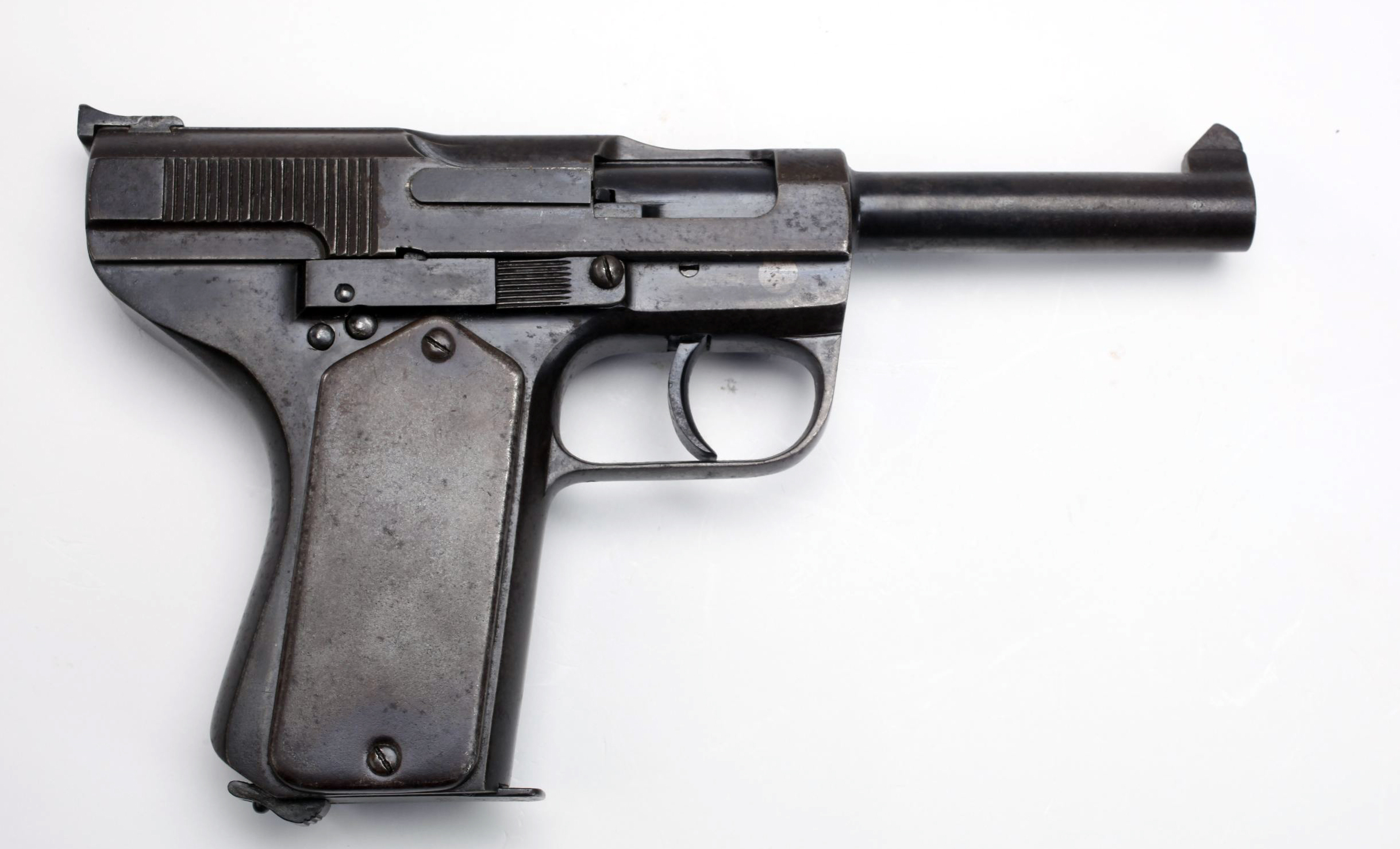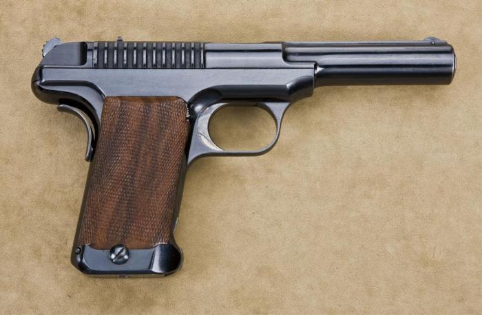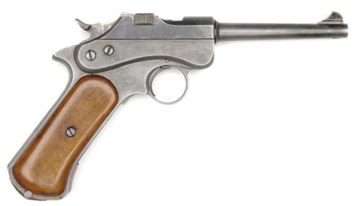 De início, a comissão adquiriu 1.000 pistolas Parabellum (Luger) da fábrica alemã D.W.M. (Deutsche Waffen und Munitionsfabrik), em calibre .30 (7,65mm Parabellum) e que foram rapidamente distribuídas à algumas tropas, para testes. O resultado destes testes, obtido através de relatórios dos comandantes, não foi muito satisfatório. O maior problema que foi reportado era o fato do calibre ser muito baixo e assim não possuía um poder de detenção (“stopping-power”) aceitável. Cumpre ressaltar aqui que as Parabellum haviam acabado de serem adotadas pelo Governo Suíço, em 1900, neste mesmo calibre.