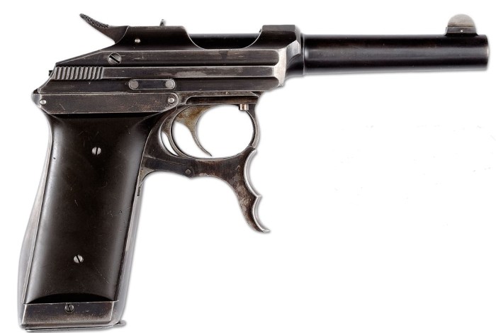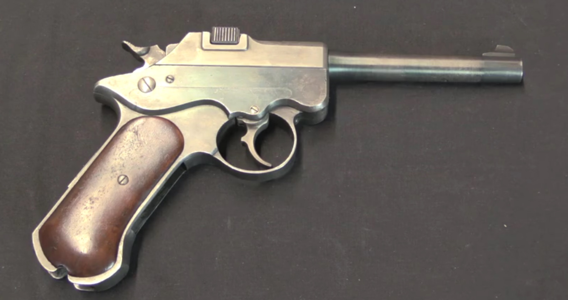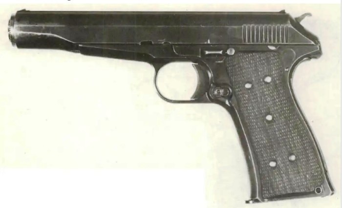 A pistola Parabellum (Luger) da firma alemã DWM, enviada para os testes já adaptada para uso do cartucho .45ACP. Acredita-se que somente dois exemplares foram produzidos e um tenha sobrevivido nas mãos de colecionador norte-americano, a da foto acima.