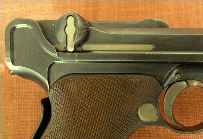 Tipo 1900 – qualquer Luger com trava de empunhadura e as características de mecanismo e de usinagem dos modelos “Old Model” (com raríssimas excessões todas as 1900 possuem trava de empunhadura).