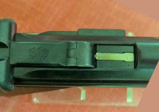 Detalhe da trava lateral do ferrolho, montada na rodilha direita do ferrolho, existente só nos modelos Old Model