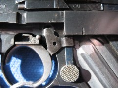 Diferença no acabamentos das “orelhas” do ferrolho, Old Model à esquerda e New Model à direita. Também notamos nesta foto a diferença da inclinação da lâmina-trava do sistema de gatilho. Nas pistolas “New Model” com trava de empunhadura a lâmina é inclinada para traz (///) como na 1900 e nos modelos sem a trava de empunhadura, a lâmina é inclinada para frente (\\\), como na foto da direita. A posição da alavanca seletora quando travada é, portanto, invertida nessas duas opções.