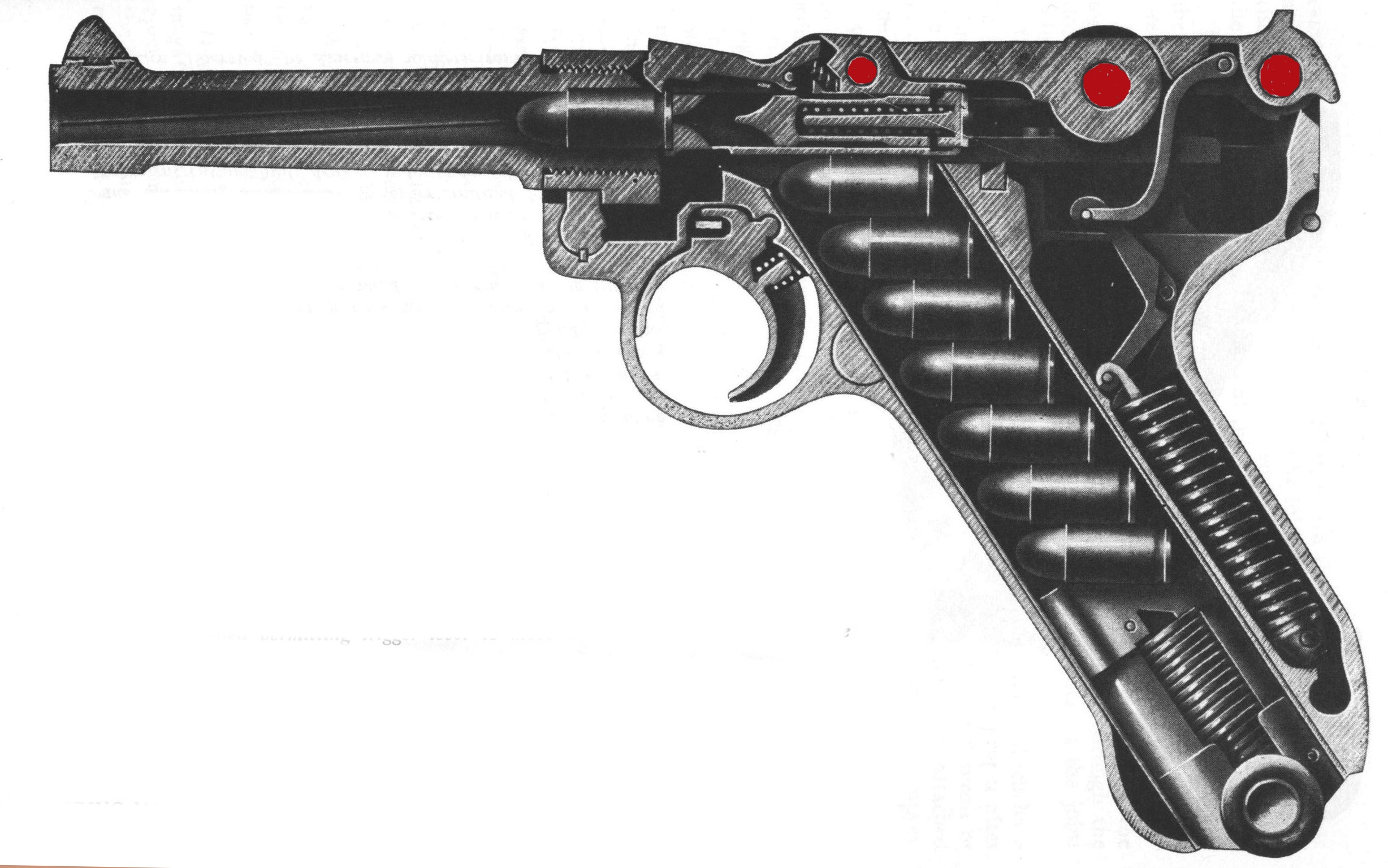O sistema ação de joelho “toggle joint” da pistola Parabellum (Luger). Os pontos vermelhos indicam as três articulações do ferrolho, que ficam perfeitamente alinhadas quando a arma está fechada. Note a biela (em formato de S) e o “link” (em formato de um V) de ligação da última parte do ferrolho com a mola recuperadora, posicionada na empunhadura, atrás do carregador.