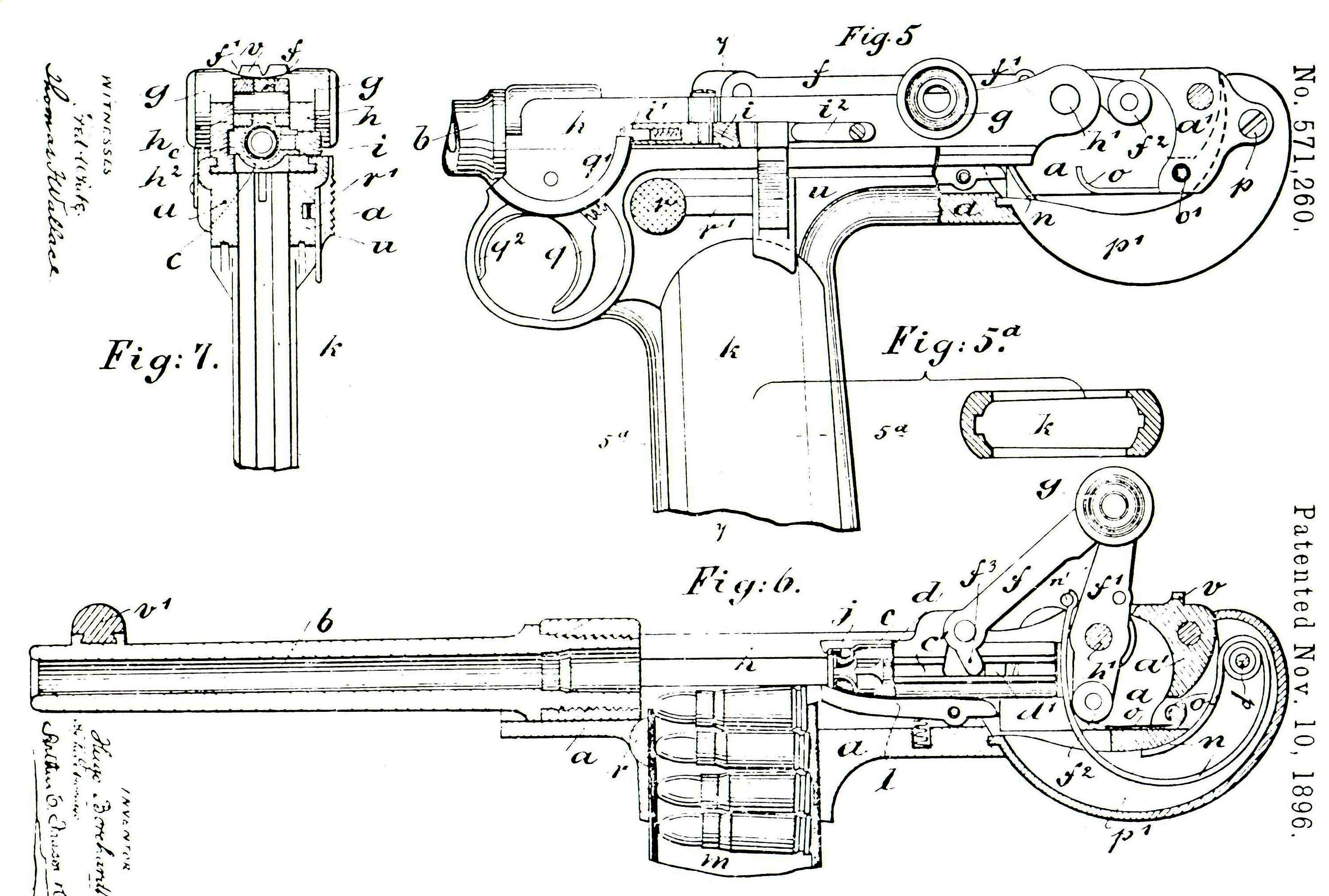 Acima, patente de um protótipo de Borchardt, datada de 1896, com algumas modificações no projeto original. As famosas rodilhas (g) do ferrolho, destinadas à servir de apoio aos dedos para abrir a culatra surgem pela primeira vez, ao invés de uma estranha alavanca lateral vista na foto abaixo. Note também o cano um pouco mais curto.