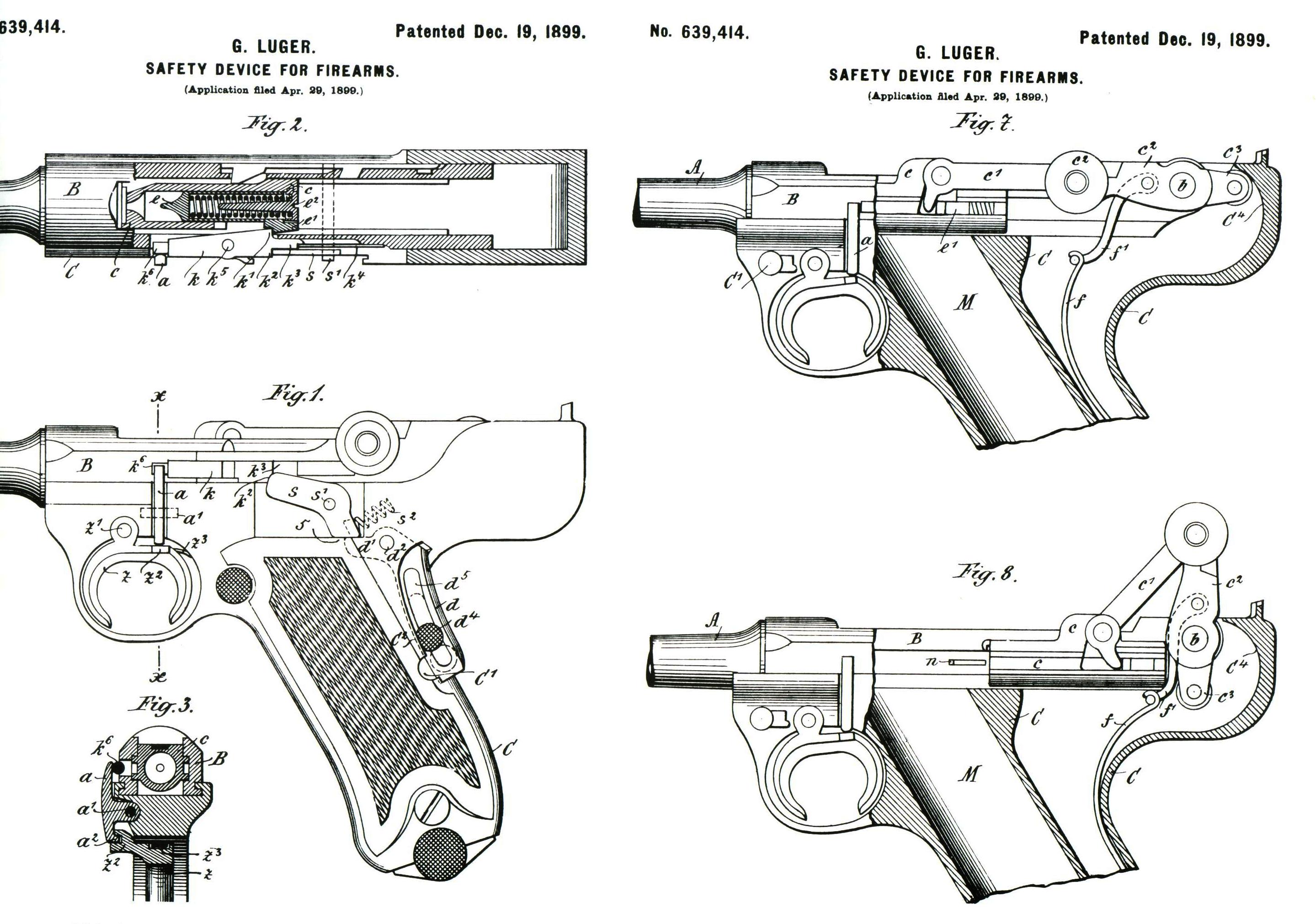 Sendo assim, em 1896, Luger patenteia seu primeiro protótipo, cujo desenho esquemático mostramos abaixo. Luger manteve a culatra no sistema de ação de joelho mas eliminou a mola recuperadora em formato de arco, que se alojava na parte traseira da Borchardt, reposicionando-a para a parte posterior da empunhadura, mas ainda em forma de lâmina (f), e que fazia um engate com o ferrolho através de uma biela (f1). Porém, Luger ainda manteve a opção do uso de uma roldana (c3) ligada à parte posterior do ferrolho, que por ocasião do recuo do conjunto cano e ferrolho no momento do disparo, era lançada contra uma curvatura interna (c4), ocasionando assim a “quebra” inicial da ação de joelho, desalinhando seus eixos.