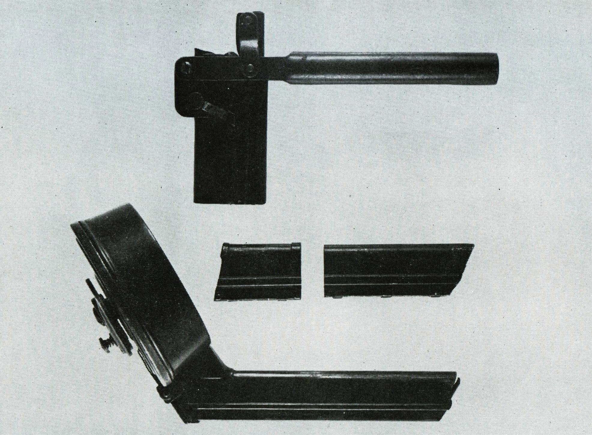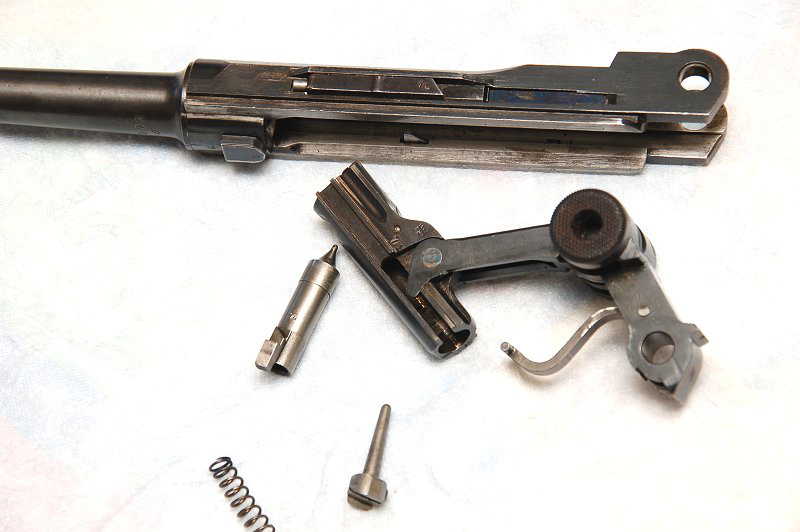 Acima, desmontagem parcial do ferrolho com a retirada do percussor, mola e retém. Note a biela em forma de um S fixada à última parte do ferrolho, que serve de ligação com a mola recuperadora.