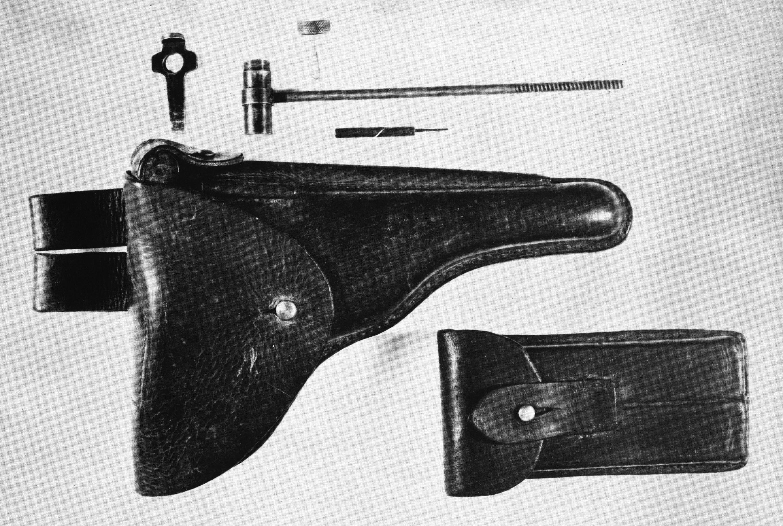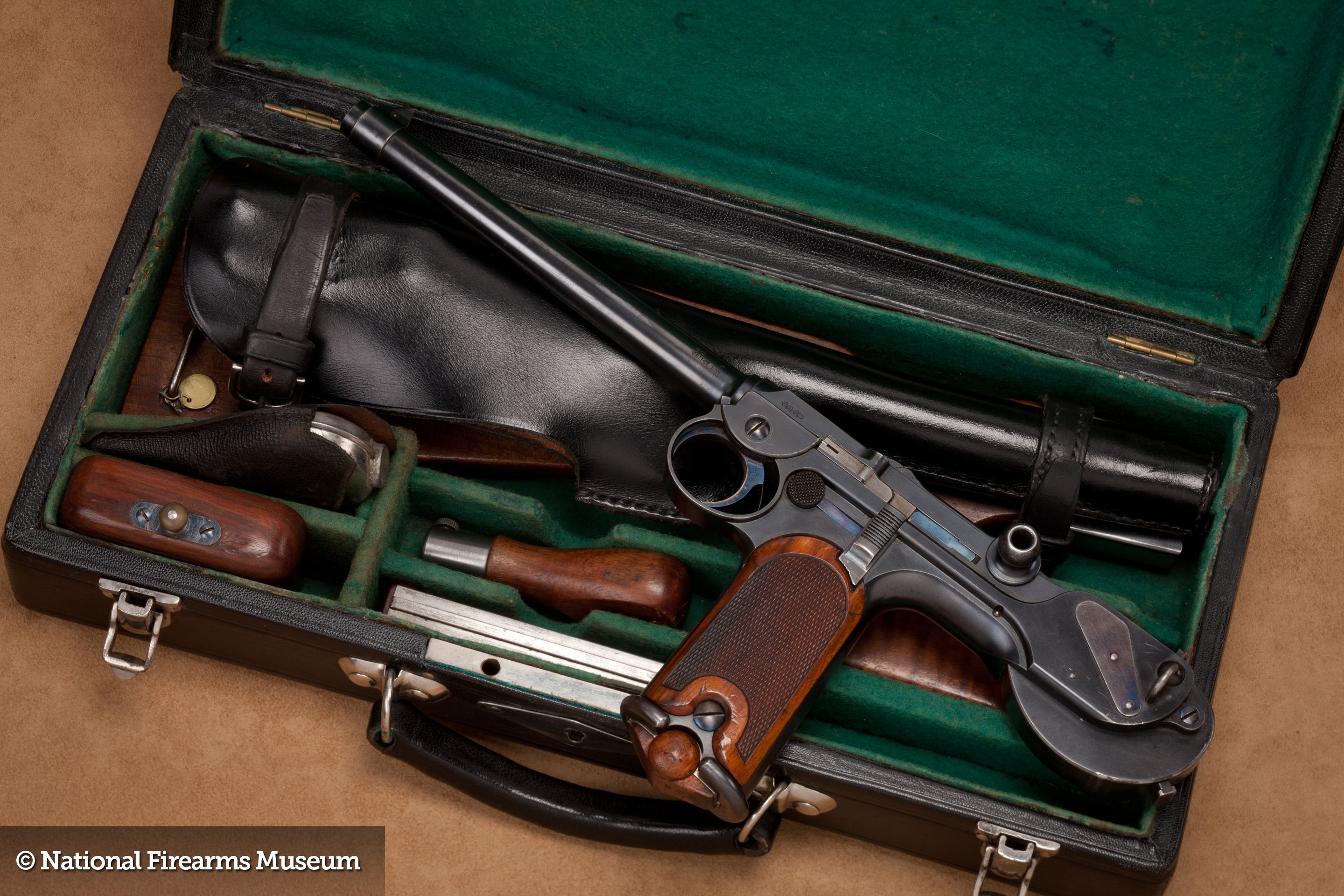 Pistola pertencente à coleção da NRA, um estojo completo com coldre de couro, coronha, carregador sobressalente e vários outros acessórios. Havia uma versão de um estojo maior que este acima, com tres carregadores e alguns outros acessórios, hoje avaliados, e alguns leiloados, por mais de US$ 100.000,00.