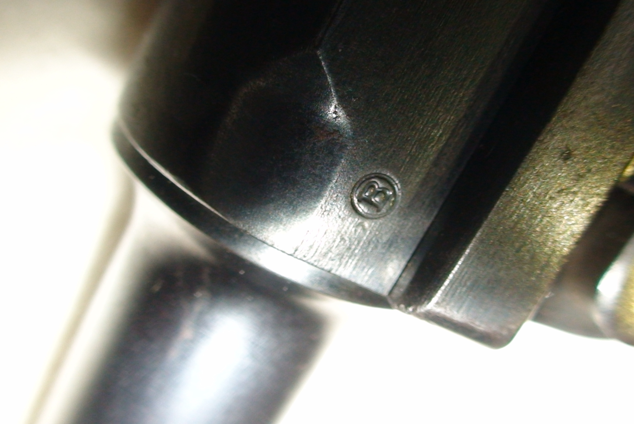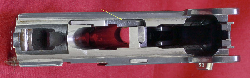 Do lado esquerdo do prolongamento do cano e bem próximo à esse, há a única marca de prova desta arma, a do inspetor militar brasileiro: um pequeno círculo com a letra “B” em seu interior, muito similar à mesma empregada pela D.W.M. em seus fuzís Mauser do Contrato Brasileiro de 1908. Como já dissemos, sobre a câmara não há nenhuma gravação, seja ela de brasões ou de datas. O extrator possui a inscrição em português “CARREGADA” em seu lado esquerdo, visível quando da presença de um cartucho carregado. Essa inscrição era idêntica às pistolas do contrato português.