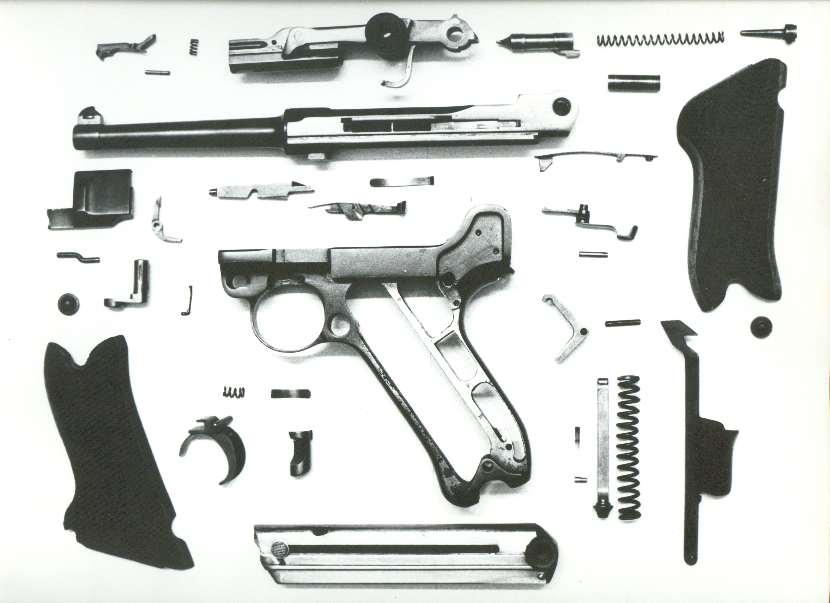 Vista explodida de uma 1906 em calibre 7,65mm com trava de empunhadura – somente o conjunto da ação de joelho permaneceu montado, o que é aconselhável.