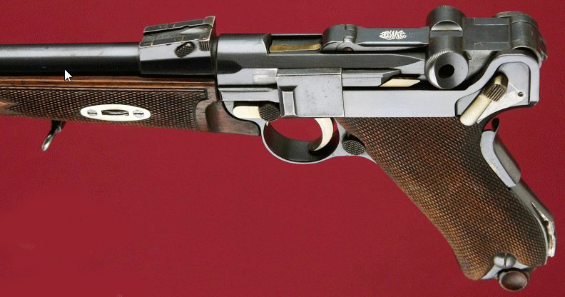 5) o extrator, antes construído de uma fina lâmina de aço, foi trocado por um novo, usinado em uma peça de aço maciço. A partir dessa modificação, quando há um cartucho na câmara, a parte superior do extrator se projeta para fora, servindo como um alerta tanto visual como através do tato, de que arma se encontra carregada. A face lateral esquerda do extrator, quando visível (com a presença de um cartucho na câmara), exibe a palavra em alemão “GELADEN”, que significa “carregada”. Nas pistolas dos contratos brasileiro e português, por exemplo, a gravação é a palavra “CARREGADA”. Nas Lugers American Eagle, a inscrição usada era “LOADED”.