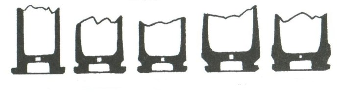 Na ordem, cartuchos com aro (rimmed), semi-aro (semi-rimmed), sem aro (rimless), rebatido (rebated) e cinturado (belted)