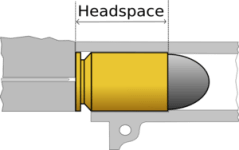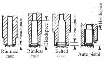 Baseado nisso, temos na figura acima as diferentes maneiras de se medir o “headspace“, dependendo do tipo do estojo e de sua base. Nos estojos “rimmed“, o “headspace” é exatamente e tão somente a espessura do aro do estojo, que age como encosto na entrada da câmara. Nos estojos “rimless“, como não há aro, o limite de posição do cartucho é o gargalo; o “headspace” é, neste caso, o comprimento do final do ombro do estojo até sua base. Nos mais raros estojos “belted“, o próprio “cinturão” serve como encosto, e o “headspace” neste caso é a medida do início do cinturão até sua base.