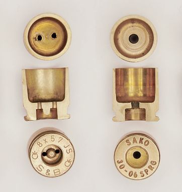Foto: À esquerda, vista interna, corte lateral e base de um cartucho 8X57mm Mauser, sistema Berdan – à direita, o mesmo num cartucho 30-06 no sistema Boxer.