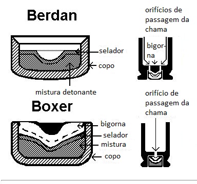 Acima: espoleta e esquema do sistema Berdan, com bigorna incorporada ao cartucho e dois orifícios de passagem da chama. Embaixo: espoleta e esquema do sistema Boxer, com bigorna independente e um só orifício central.