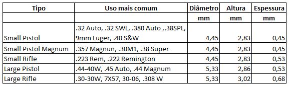 As espoletas da atualidade são classificadas conforme seu tamanho e dureza, dependendo de quais tipos de estojo elas são empregadas. A tabela a seguir resume quais os tipos em uso: