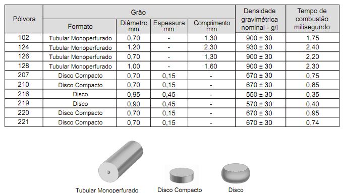 Nesta tabela, fornecida pelo fabricante, temos as informações sobre o formato, dimensões e a combustão, medida em milisegundos. Com esse último parâmetro estabelece-se o fator que determina se a pólvora é do tipo queima lenta ou queima rápida, importantíssimo para as aplicações a que se destina.