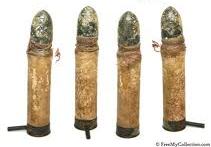 À esquerda temos um esquema de como era montada a espoleta no interior do cartucho e seu respectivo pino. Na foto central e da direita, cartuchos Lefauchex de calibre 12mm para uso em revólveres militares.
