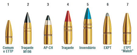 Neste quadro temos as pontas destinadas aos cartuchos .308 Winchester e 7,62mm X 51 com suas respectivas características de utilização, sendo as 5 primeiras para uso militar e as 6 e 7 para caça e tiro esportivo, respectivamente. O projétil ETPT Match é o utilizado para tiros de precisão em competições oficiais. (Fonte: CBC).