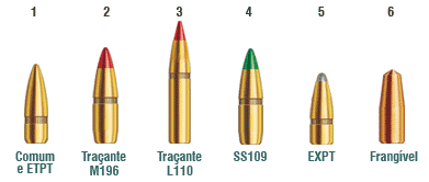 Acima um quadro de projéteis do calibre 5,56mm X45, com diversas utilizações: (1) ponta para alvos não blindados, (2 e 3) munição traçante, (4) pontas para alvos blindados, (5) ponta de chumbo encamizada para caça e (6) projétil frangível. (Fonte: CBC)
