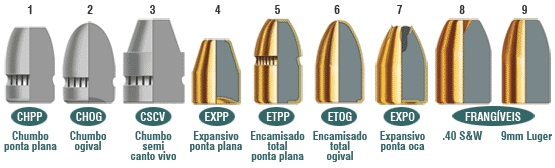 À esquerda vemos alguns projéteis de produção da CBC, para uso em revólveres, notadamente em calibres .38 Special, .357 Magnum e .44 Magnum. As pontas, por sua vez, podem ser planas e maciças, ou podem ser ocas, o que facilita ainda mais a sua deformação.