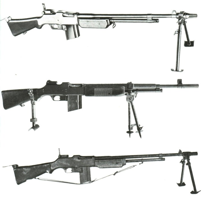 Acima os tres modelos básicos do Fuzil Automático Browming: modelo 1918, 1918A1 e 1918A2 – neste último, note o monopé incorporado abaixo da coronha e o bipé montado na dianteira.