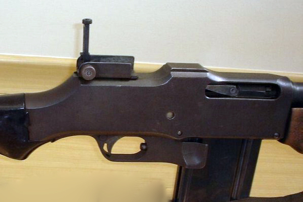 Lateral da caixa de culatra de um B.A.R. modelo 1918A2 com sua alça de mira levantada.