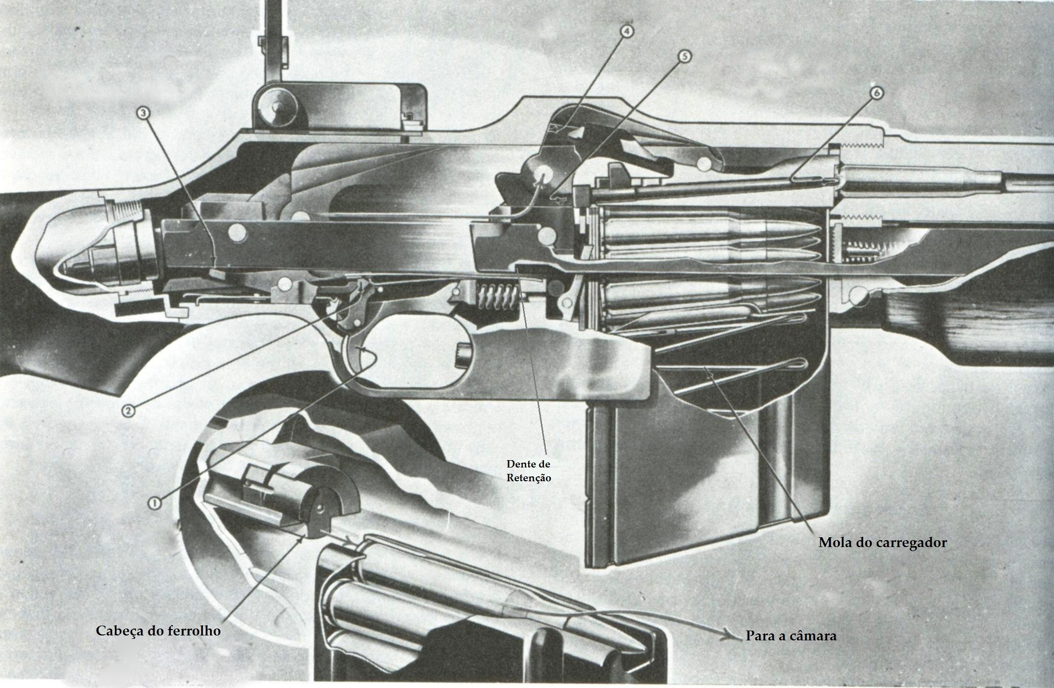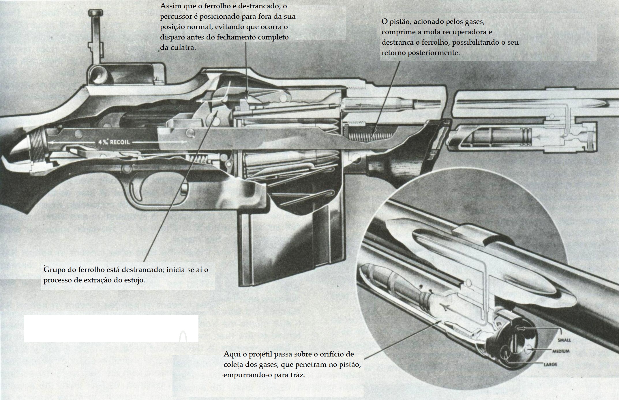 No esquema acima, logo após o disparo do cartucho, o projétil sai em direção à boca do cano passando sobre o orifício de coleta dos gases, em detalhe na figura. Esse orifício situa-se a cerca de 14cm. da boca do cano. Há uma válvula de regulagem da passagem dos gases, com tres opções de tamanho, que pode ser ajustada de acordo com o uso e medida que a sujeira acumulasse. Assim que o projétil ultrapassa o orifício, os gases passam pela válvula, penetram no cilindro e impulsionam o pistão para trás. O pistão empurra um êmbolo, que comprime a mola recuperadora (bem abaixo da câmara) e também destrava o ferrolho, fazendo-o soltar-se do seu encaixe da parte superior da armação.