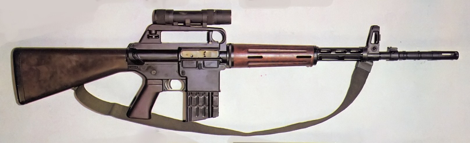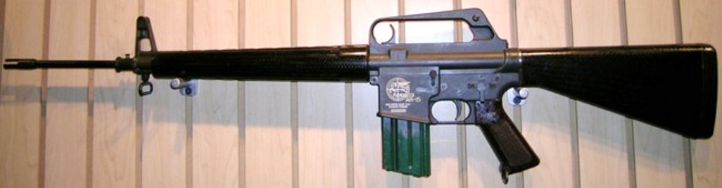 Uma das primeiras versões do AR-15, ainda com a alavanca de ferrolho na parte superior, no vão interno da alça de transporte.