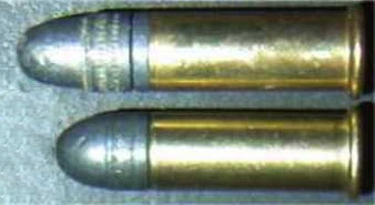 Ao lado, notamos a pequena diferença entre o já obsoleto .22 Long (cartucho inferior) e o .22 Long Rifle (cartucho superior) – na verdade, as cápsulas são iguais, o que muda é comprimento do projétil.