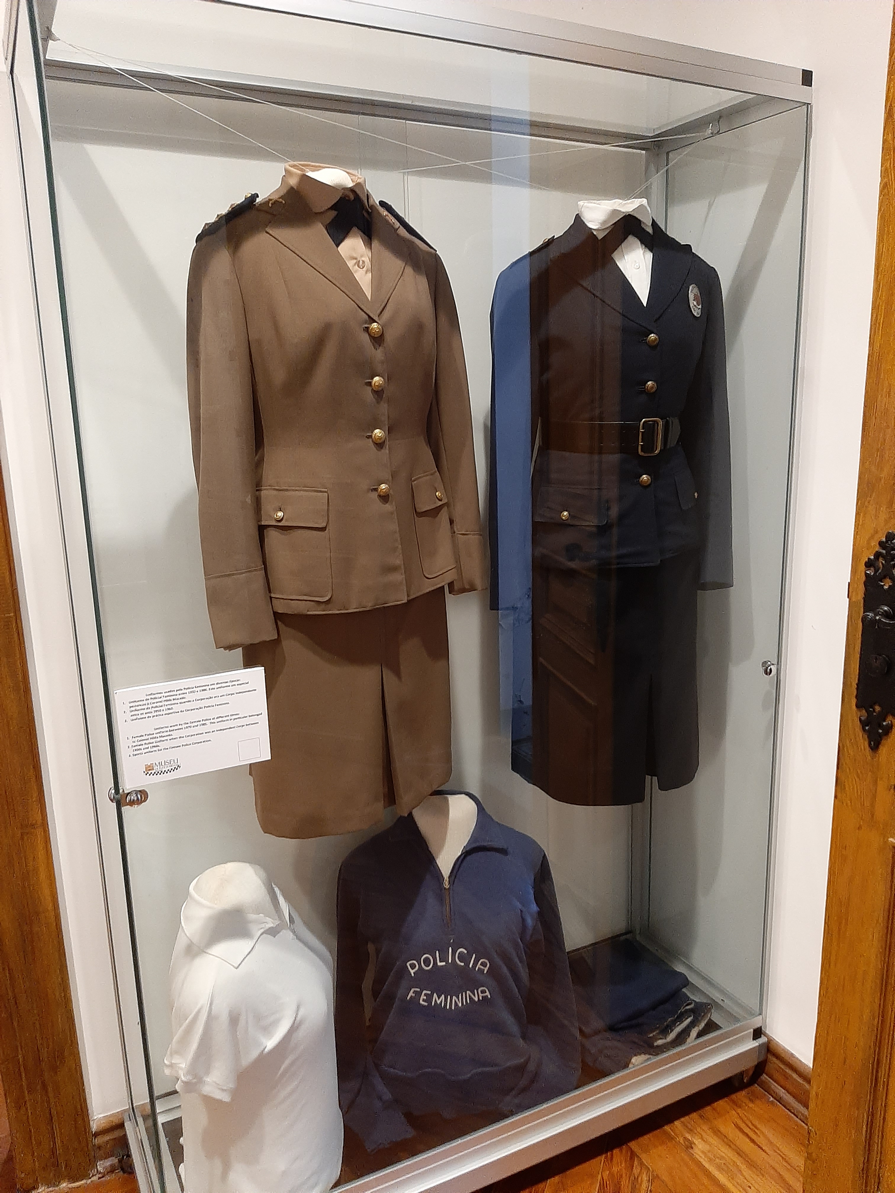 Mostruário com uniformes da idealizadora e fundadora da Polícia Feminina de São Paulo, Cel. Hilda Macedo (1916-2005).