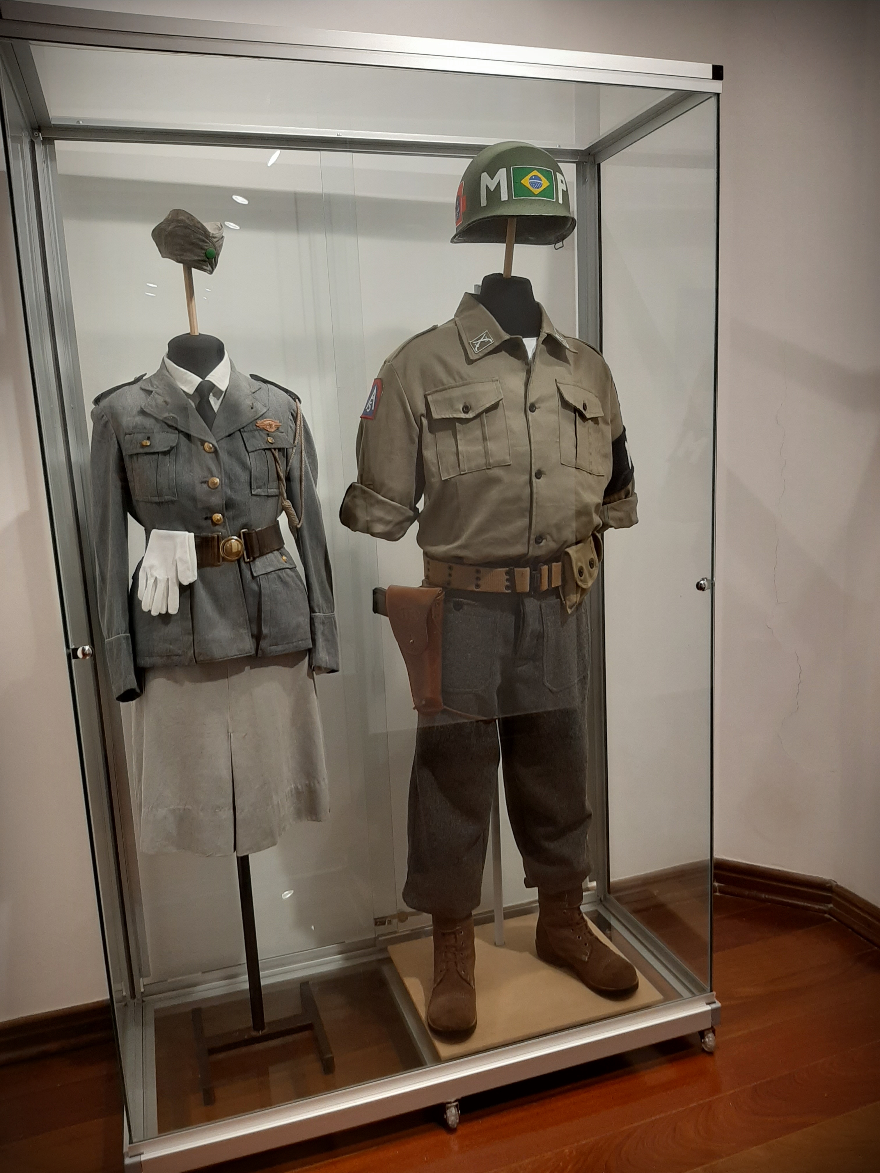 Mostruário com uniformes usados durante a II Guerra Mundial pela Organização Feminina Auxiliar de Guerra (à esq.) e de um Military Policeman da Força Expedicionária Brasileira (á dir.).