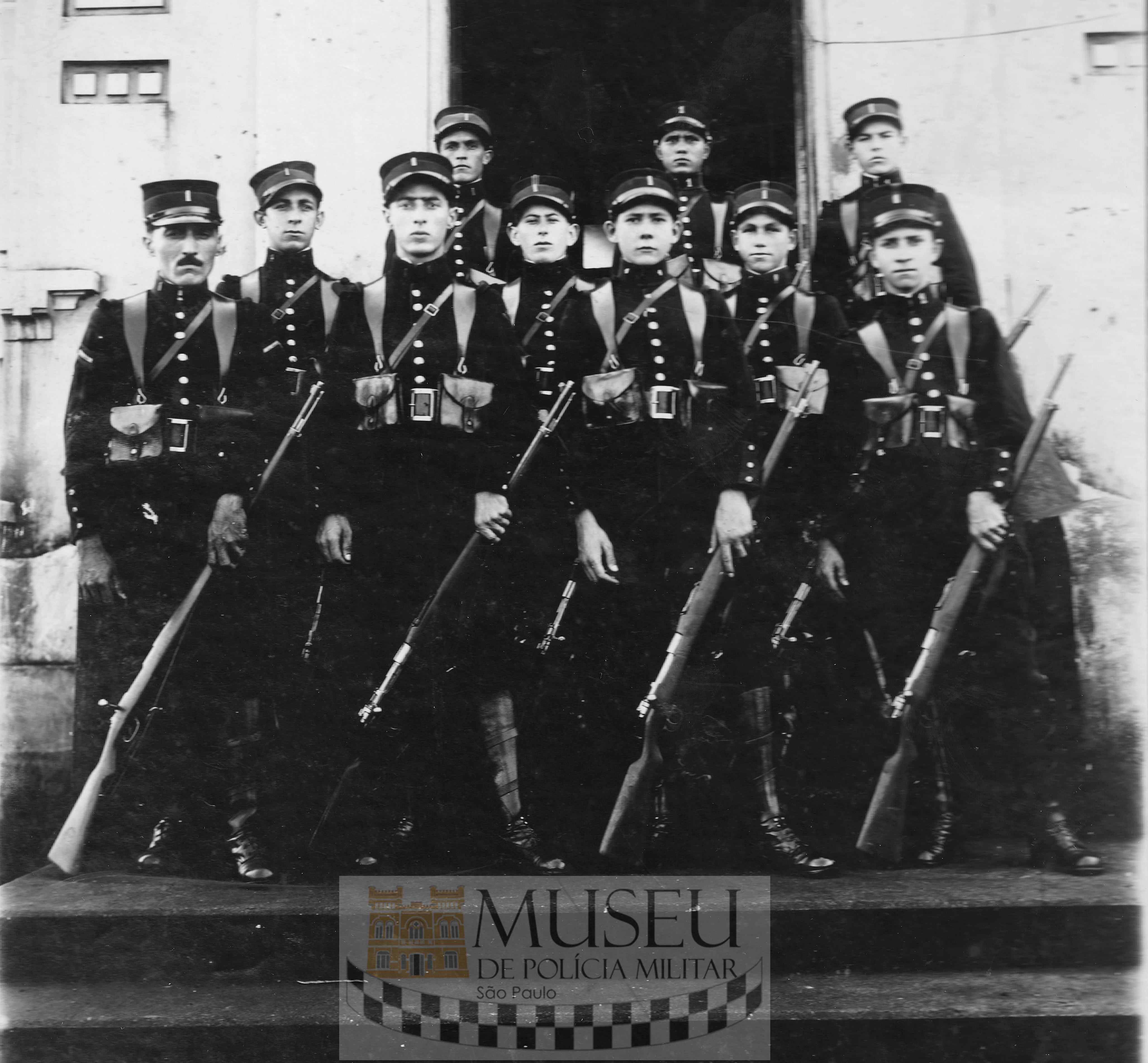 Soldados do 4º Batalhão de Caçadores da Força Pública fotografados em 1910. Armados com fuzis Mauser Modelo 1908, calibre 7 X 57, já é evidente a influência resultante da Missão Francesa contratada pelo governo paulista em 1906.