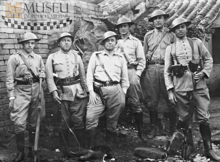 Voluntários paulistas (identificados pelos capacetes de aço) posam para a câmera com uma variedade de armas que reflete a mobilização da população em prol do ideal constitucionalista. Ao lado do fuzil regulamentar Mauser 1908, vemos a carabina Winchester Modelo 1892 e uma variedade de revólveres.
