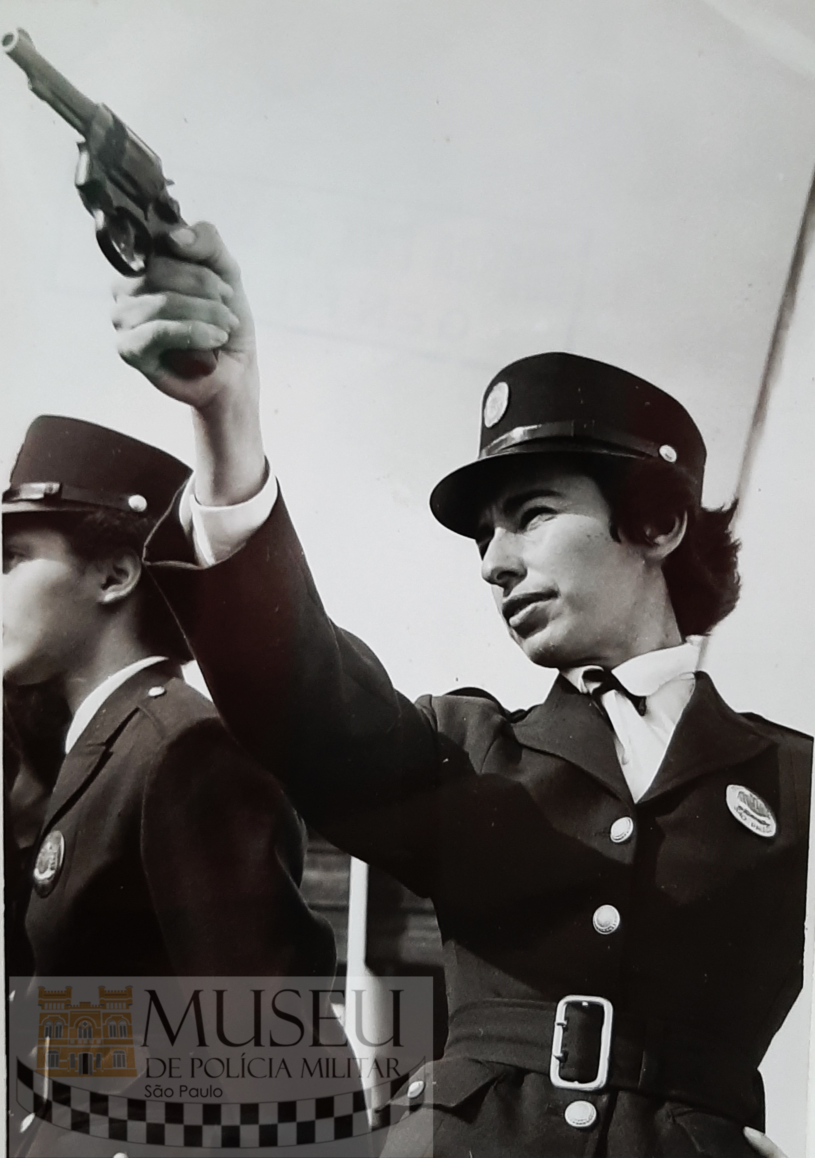 Integrante da Polícia Feminina treinando com um revólver Taurus Modelo 80, no Club de Regatas Pinheiros em abril de 1964. Criada em 1956 como uma instituição à parte, a Polícia Feminina seria integrada à Força Pública em 1966.