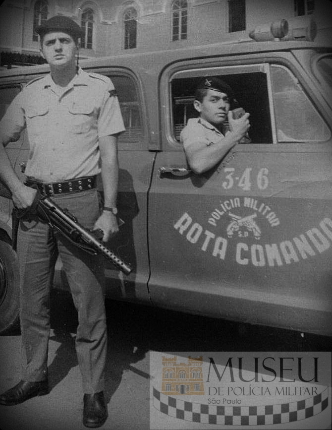 Membros da radio-patrulha da ROTA (Ronda Ostensivas Tobias Aguiar, do 1º Batalhão de Choque da PMESP) fotografados no fim dos anos 1970. O soldado fora da viatura usa uma vetusta submetralhadora Schmeisser MP28.II (adquirida pela Força Pública paulista na década de 1930).