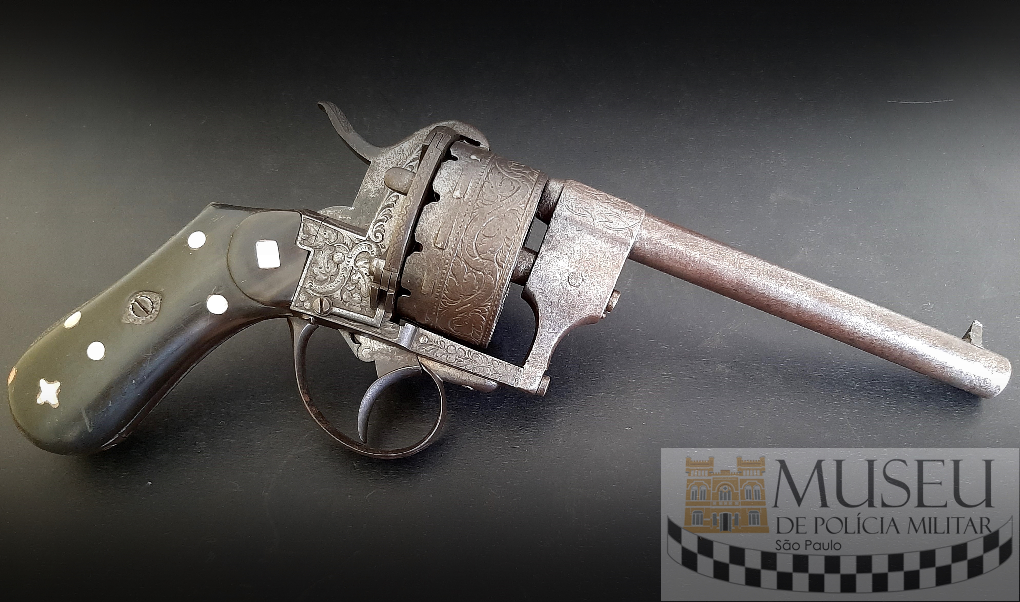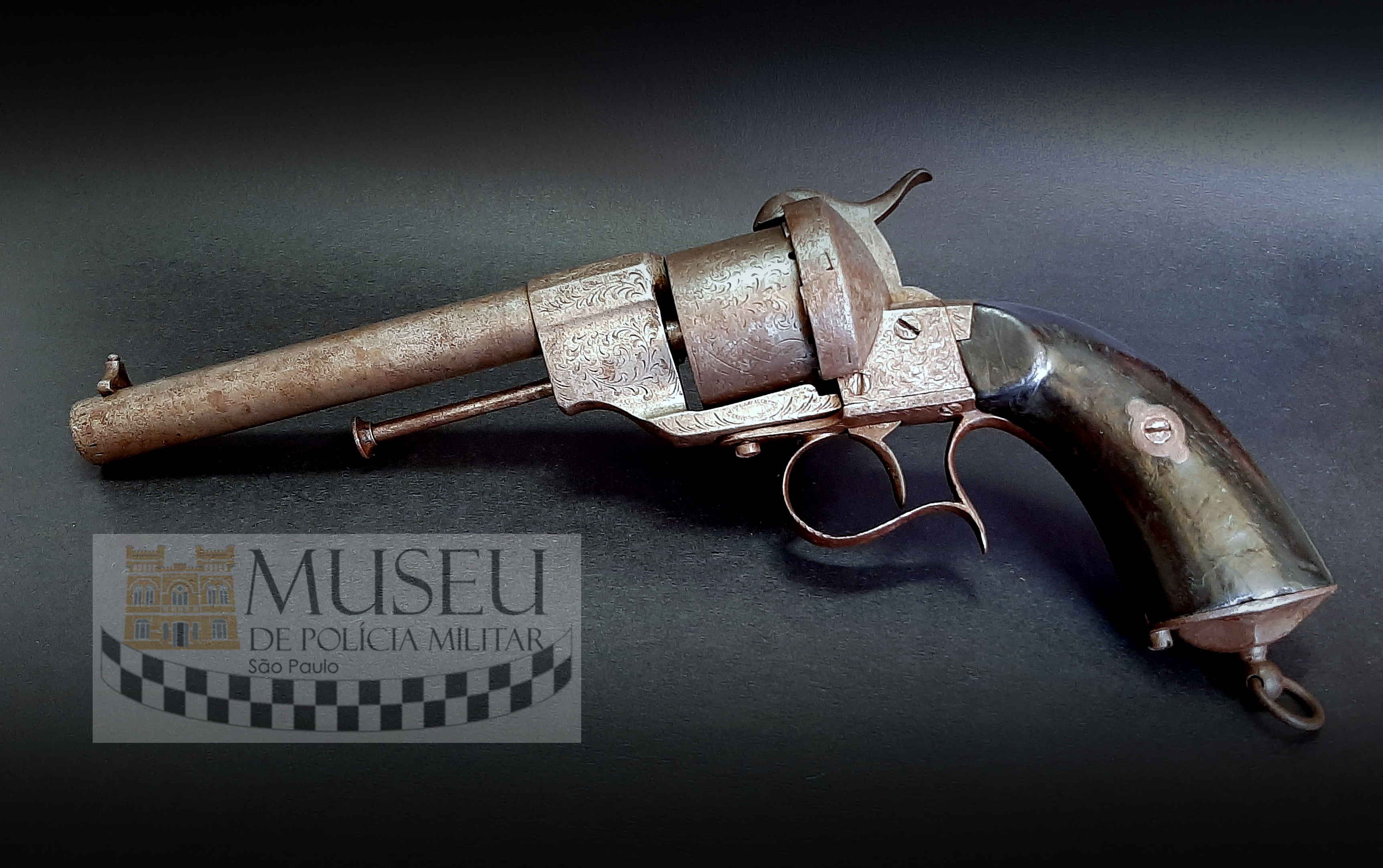 Revólver Lefaucheux Modelo 1854, calibre 11 mm pinfire, usado durante a Guerra da Tríplice Alliança (1864-1870).