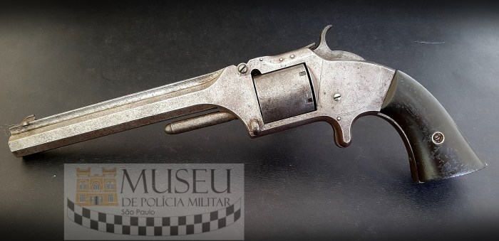 Revólver Smith & Wesson Modelo 1 ½, contemporâneo da Guerra da Tríplice Aliança, calibre .32 SW de fogo circular.