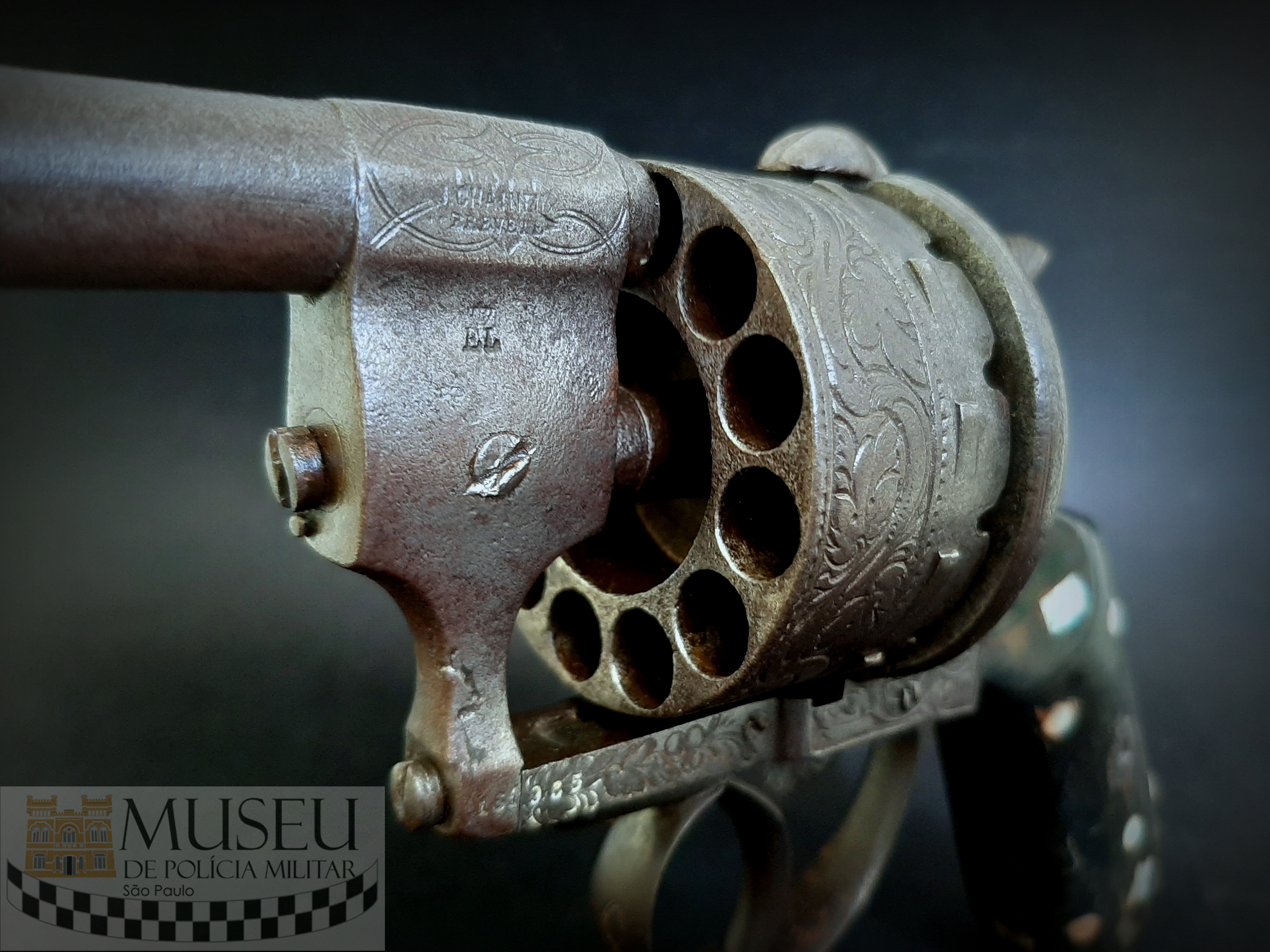 Outro provável veterano da Guerra do Paraguai: o revólver produzido por J. Chaineux (Bélgica), com seu impressionante tambor com capacidade para 12 cartuchos calibre 9 mm Lefaucheux (“pinfire”) e abaixo detalhe do tambor desse revólver.