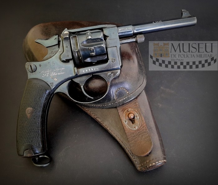 Um dos ícones da Força Pública paulista e da Missão Francesa (1906-1914): o revólver Saint Etiènne Modèle 1892, calibre 8 mm Lebel. Adquiridos entre 1911 e 1914, o exemplar da foto foi fabricado em 1913 e está com seu coldre original, que também segue o modelo usado pelo exército francês.