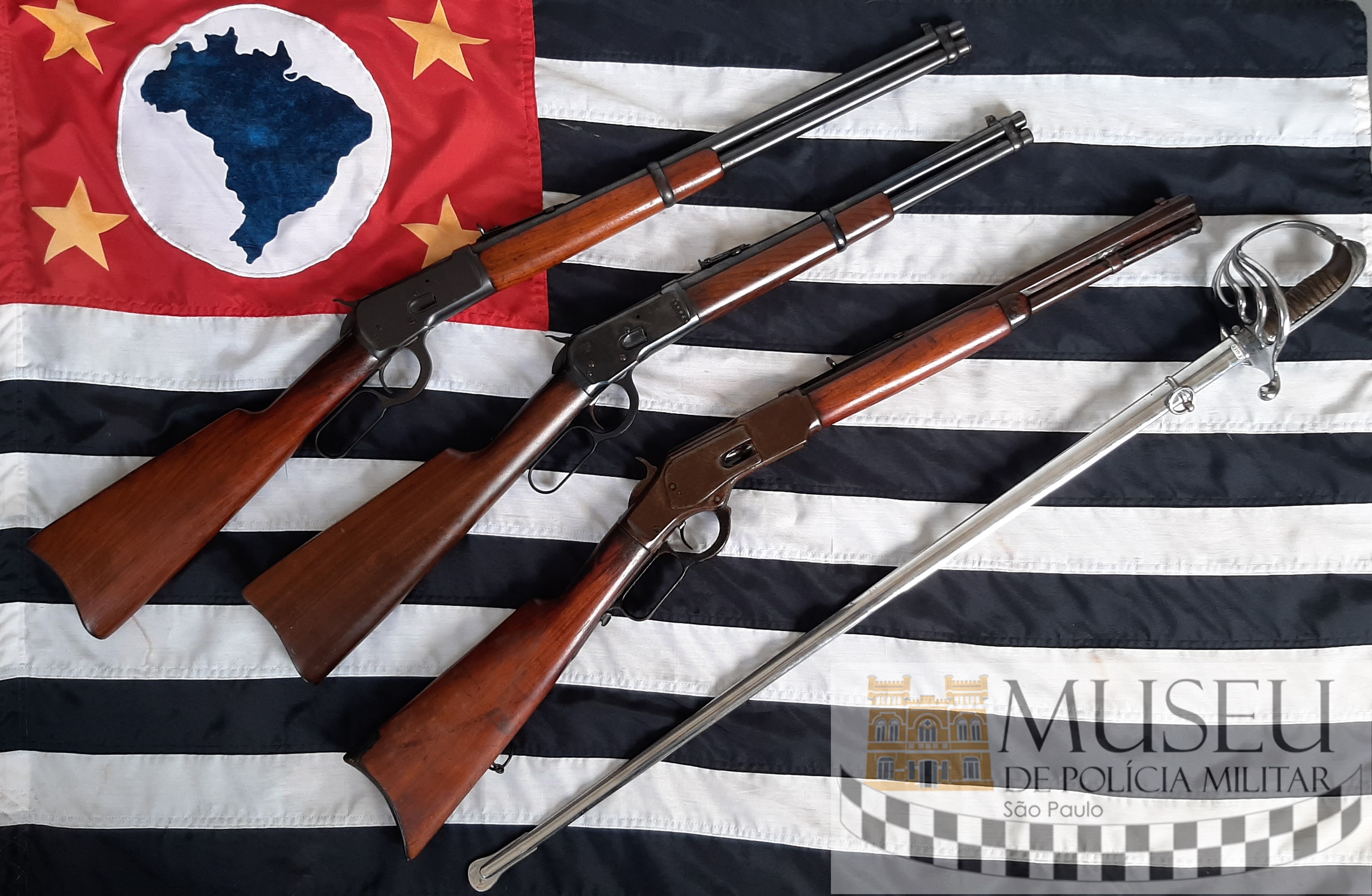 Repousando sobre a bandeira do Estado de São Paulo, três veteranas da Revolução Constitucionalista: carabinas Winchester Modelo 1892, nas versões Saddle Ring Carbine (com cano de 20 polegadas) e Trapper (com cano de 16 polegadas), e um Modelo 1873 (“papo amarelo”). Junto um sabre de oficial da Força Pública no padrão usado entre as décadas de 1910 e 1940.