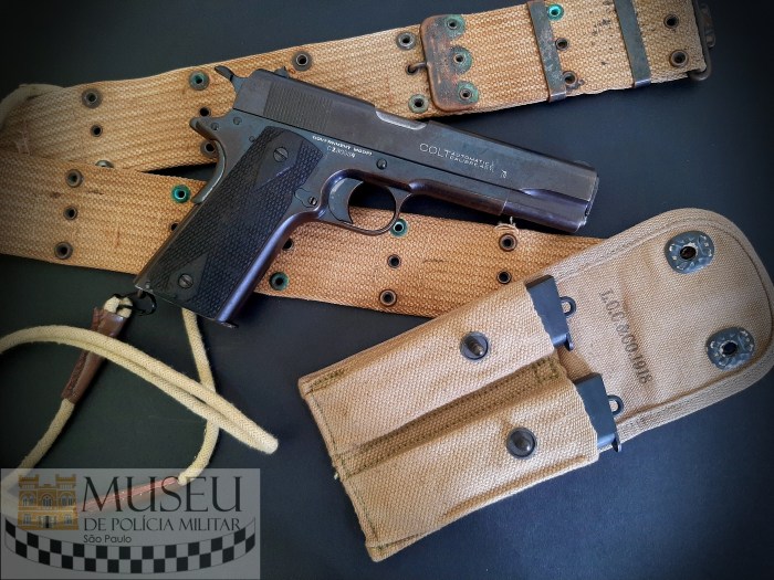 Pistola Colt Government Model 1911, calibre .45 ACP fabricada em 1921. Essa é uma das 200 primeiras pistolas deste modelo adquiridas pelo Brasil, tendo sido adquiridas pela Marinha de Guerra e entregues no lendário encouraçado “Minas Geraes”, enquanto este estava sendo modernizado em Nova York em 1921. Exibida junto de um cinto, fiel e porta carregadores padrão “Mills” (no mesmo padrão usado pela Marinha), essa arma provavelmente é uma presa de guerra resultante dos combates entre constitucionalistas e Fuzileiros Navais na região de Cunha em 1932.