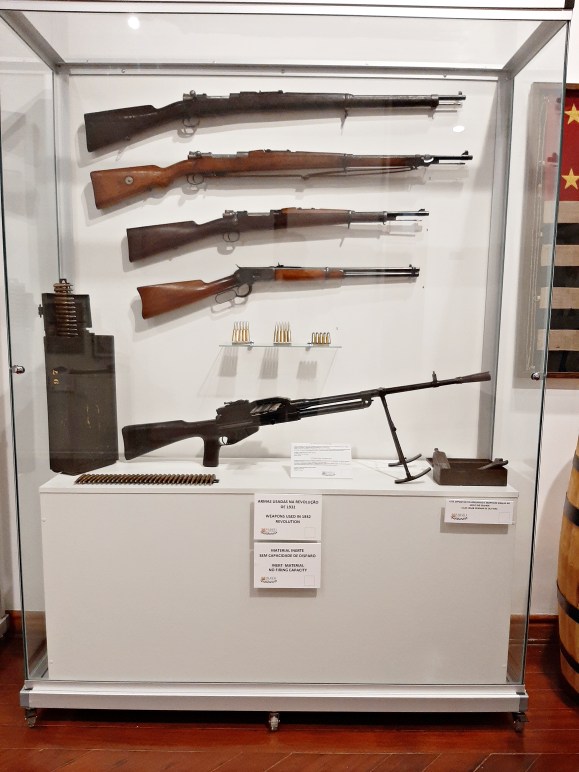 Mostruário exibindo as principais armas longas portáteis usadas durante a Revolução Constitucionalista de 1932: fuzil Mauser Modelo 1894, fuzil Mauser Modelo 1908, mosquetão FN Mauser Modelo 1922, carabina Winchester Modelo 1892 e o fuzil metralhador Hotchkiss Modelo 1921.