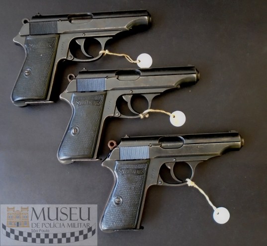 Três exemplares da pistola Walther Modelo PP, calibre .380 ACP (em alemão, 9mm Kurz), que foram adquiridas pela Força Pública paulista em 1936. Essas armas permaneceriam em serviço por sete décadas, sendo finalmente retiradas de serviço em 1999-2000. Detalhe para o retém do carregador, localizado na base da empunhadura.
