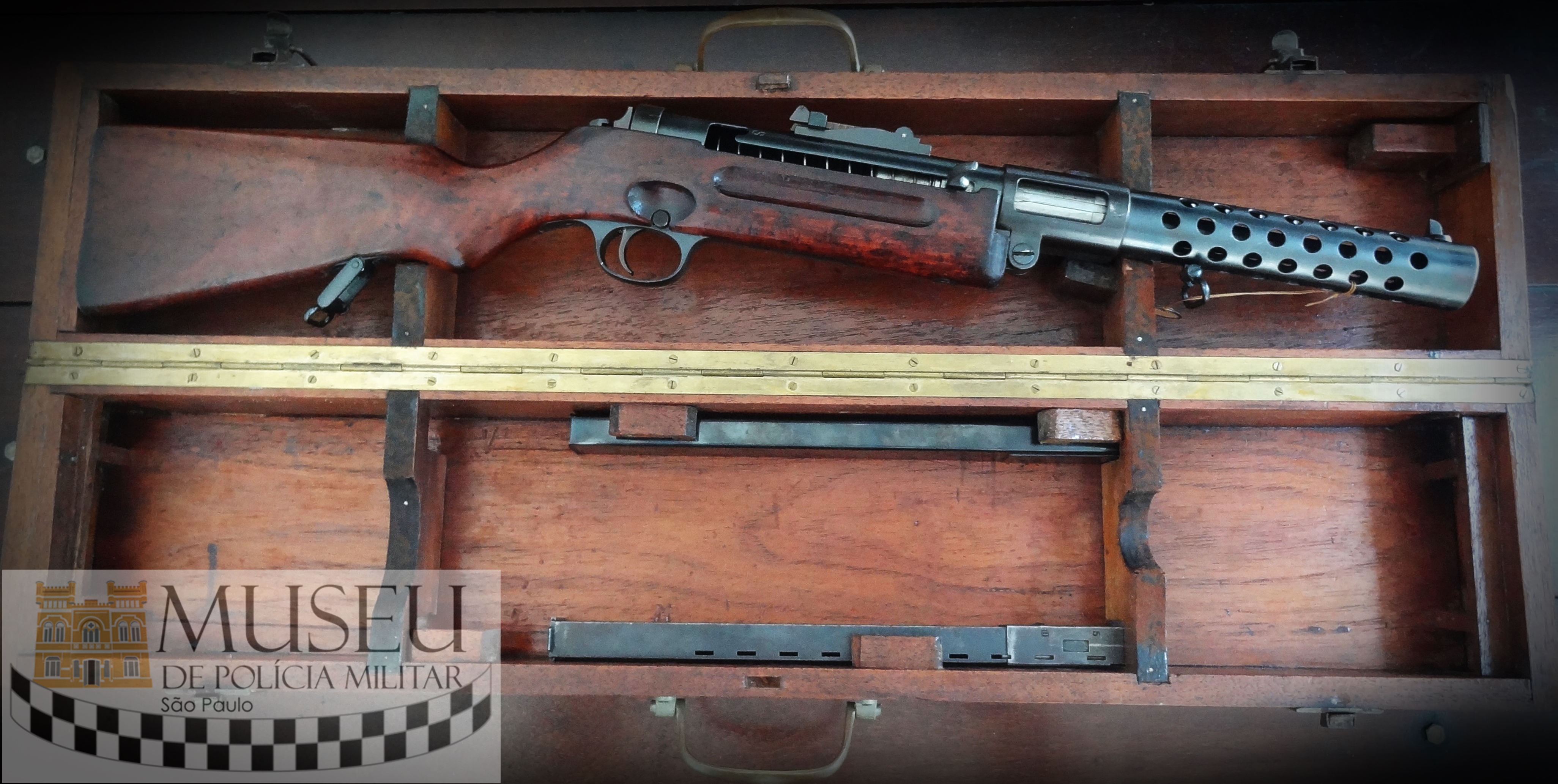 Lindo exemplar da submetralhadora alemã Schmeisser MP28.II, calibre 7,63 Mauser, acondicionada em sua caixa de transporte. Adquiridas por volta de 1934, essas armas tiveram um uso longevo nas forças policiais de São Paulo, testemunho da qualidade destas armas.
