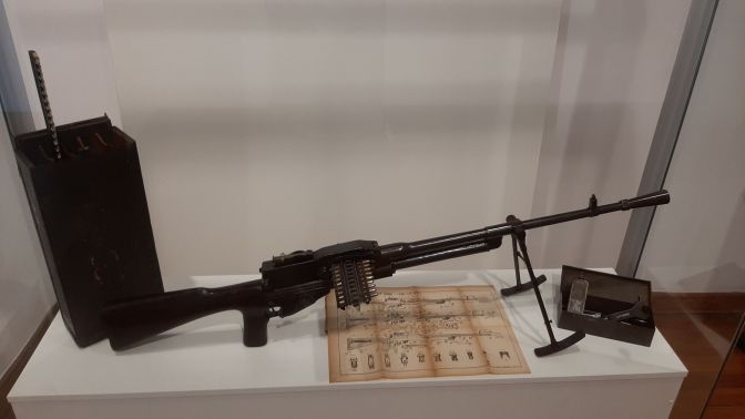 Detalhe do fuzil metralhador Hotchkiss Modelo 1921, ao lado de sua caixa de munição e conjunto de ferramentas de manutenção.