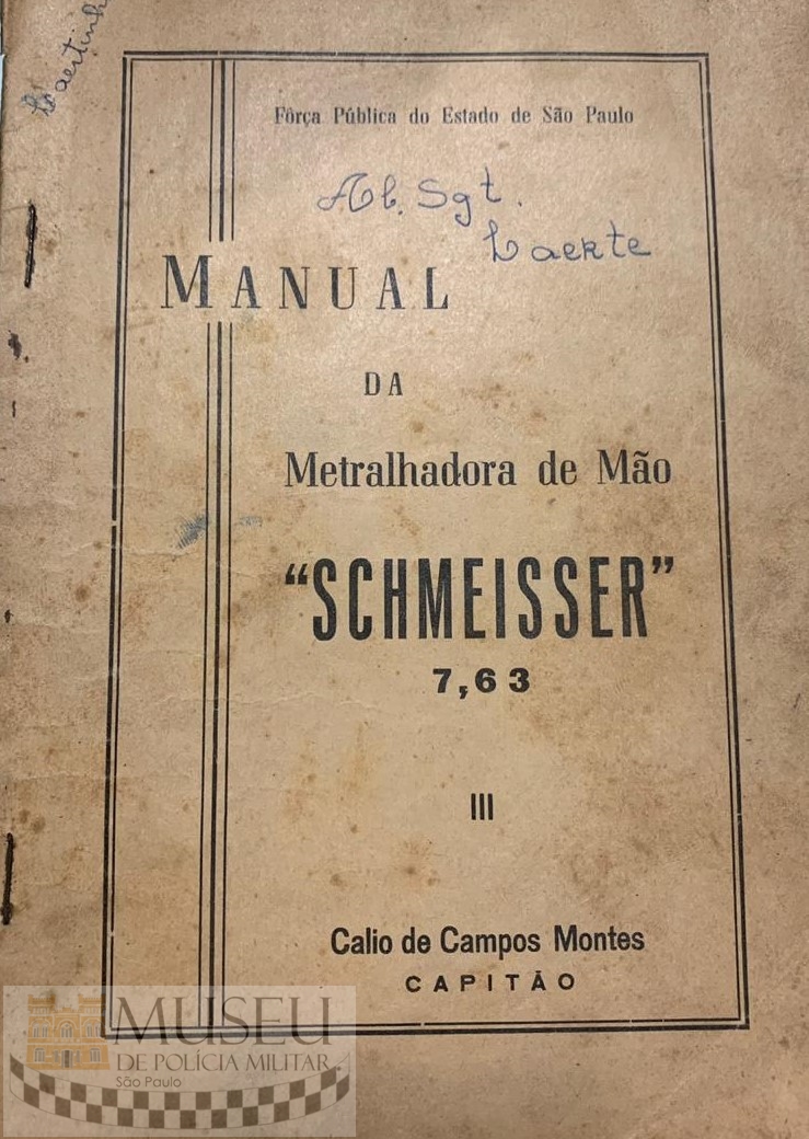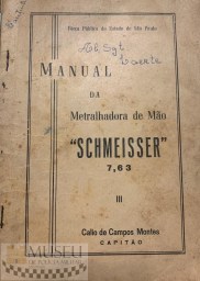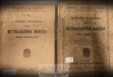Manuais da metralhadora Madsen Modelo 1932. Manuais históricos como esses, podem ser consultados na biblioteca do Museu. O da direita é o manual da submetralhadora alemã Schmeisser MP28.II, editado pela Força Pública de São Paulo na década de 1950. Clique na foto para ampliar.