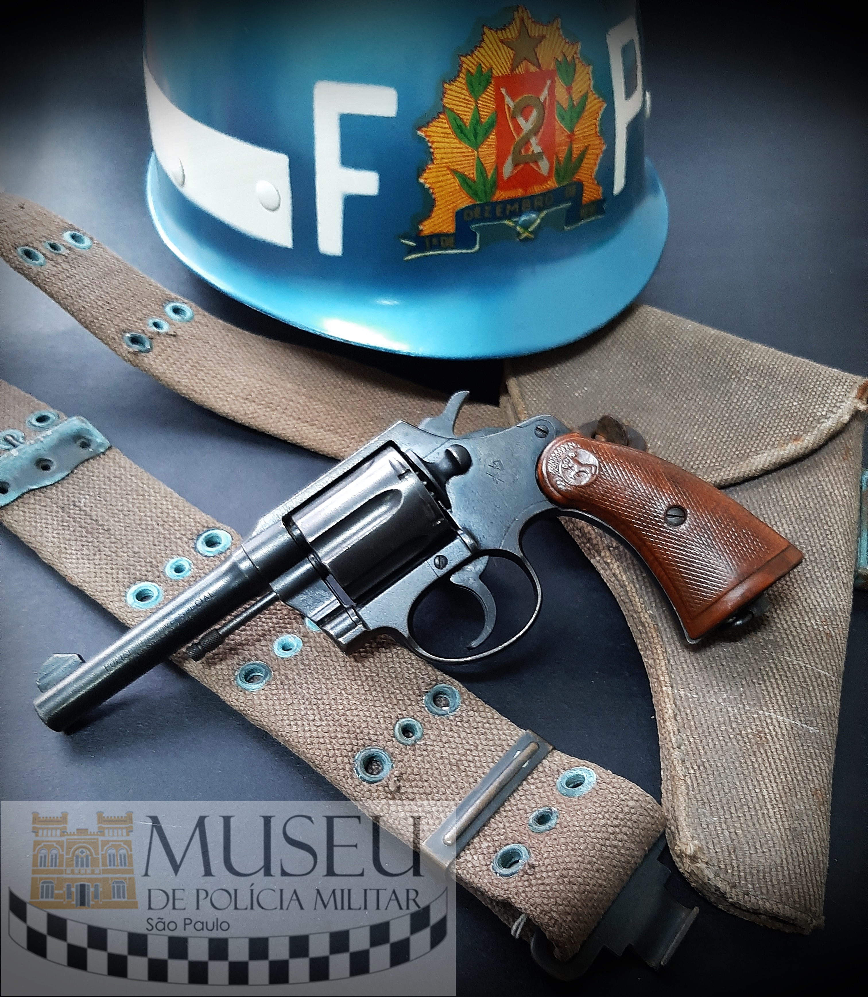 Uma das armas que consolidou o calibre .38 Special como munição policial por excelência depois da II Guerra Mundial: o Colt Police Positive Special. O exemplar da foto, fabricado em 1950, é exibido com o coldre e cinto de serviço, bem como o icônico capacete M1 em fibra, na cor azul da Força Pública.