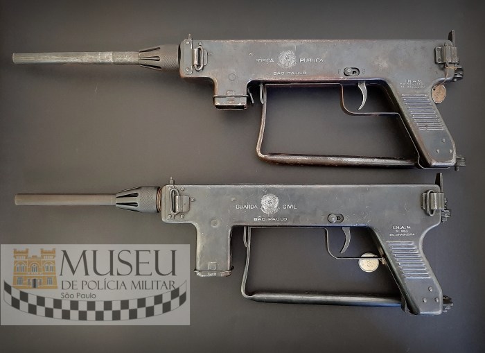 Submetralhadoras INA M950 e M953, calibre .45 ACP, com as marcações para a Força Pública e a Guarda Civil.