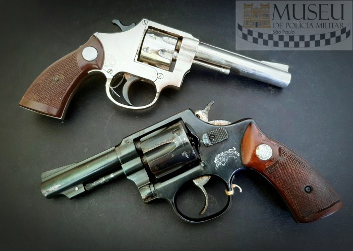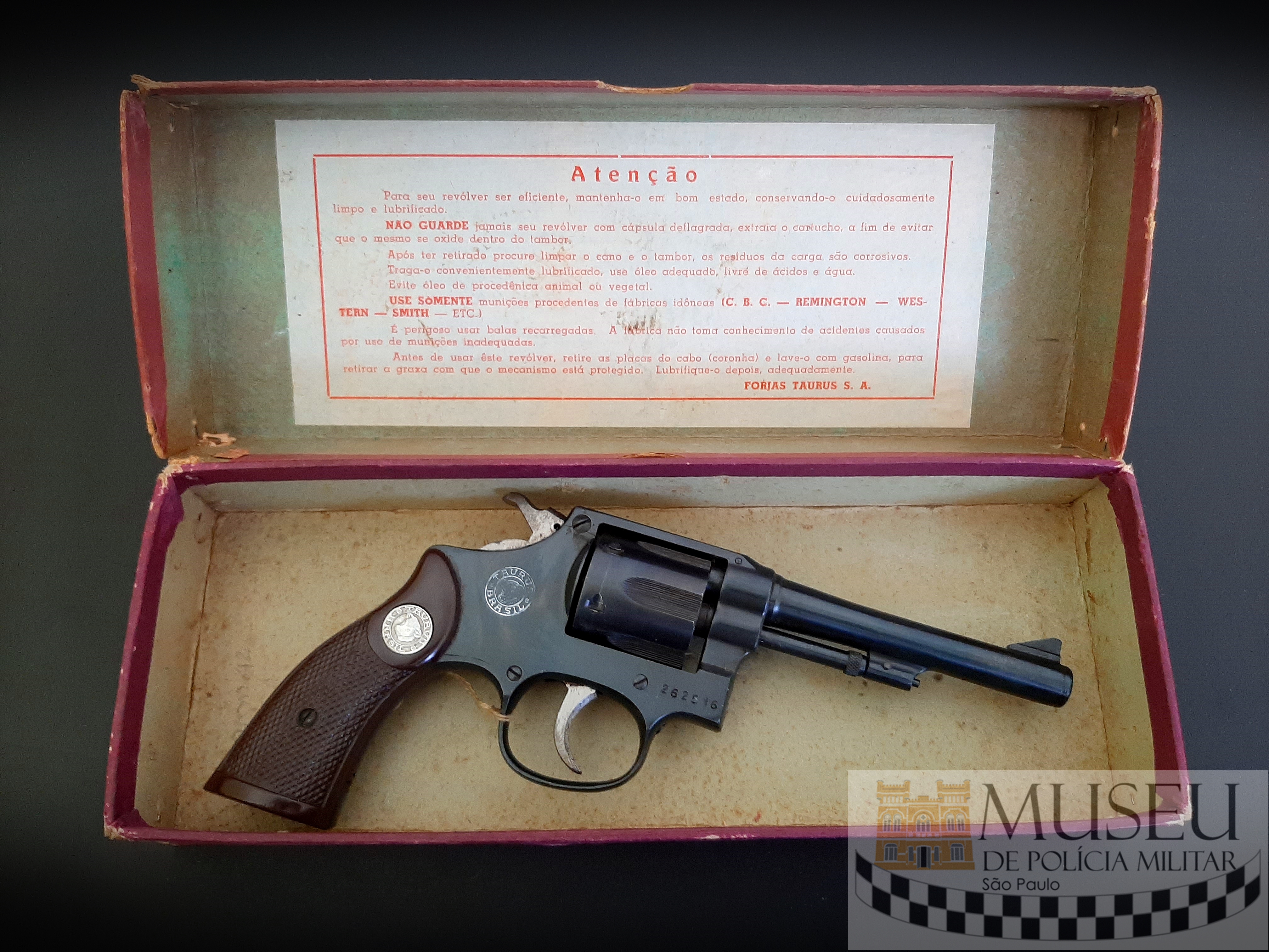 Outra arma icônica da polícia paulista, o Taurus Modelo 80 (“canela seca”). Foi, a partir da década de 1950, a primeira arma de porte nacional a equipar a polícia de São Paulo.